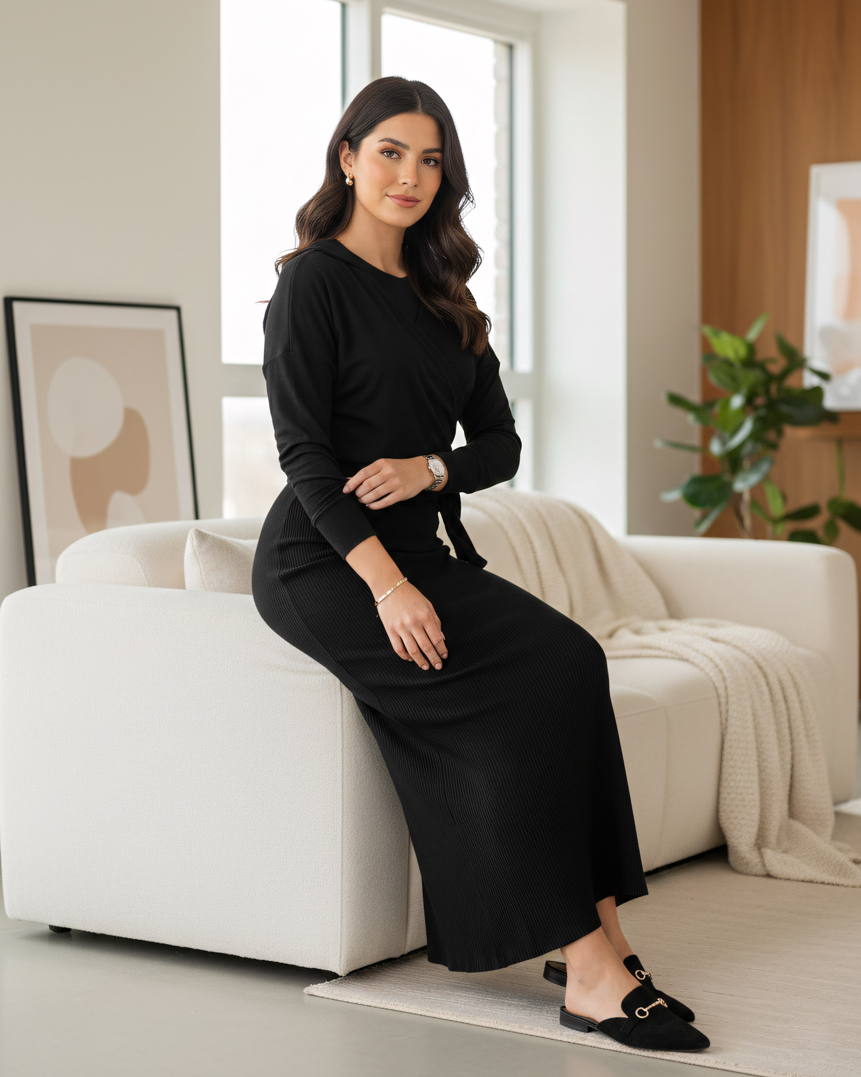 The Tokyo Top is a chic wrap tee made from our soft, breathable bamboo jersey fabric. Featuring a hood and one-sided wrap detail, it’s designed to flatter and move with you. Perfect on its own or layered over the Paris Dresses, it’s also bump-friendly—sitting beautifully over your baby bump.